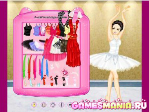 Помогите прекрасной юной танцовщице не ударить в грязь лицом перед ответственным выступлением. Более того - Вам решать, что она будет танцевать - вы можете подобрать любой сценический костюм, ведь перед вами - большой выбор платьев, блузок и профессиональных балетных пачек. Также не забудьте об обуви и украшениях для волос. Инструменты со следующей вкладки, перейти на которую можно, нажав на вторую слева картинку на нижней панели, помогут подобрать прическу и сделать макияж.