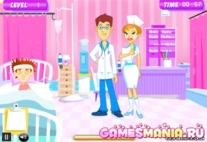 Эта игра на скорость. В больничной палате лежит очень нервный пациент. А доктор с медсестрой влюблены в друг друга и им так хочется поцеловаться. Но нельзя нервировать больного. Помогите доктору и медсестре поцеловаться так, чтобы этого не заметил больной, а он пристально за ними наблюдает. Но игра усложняется еще и тем, что за одну минуту Вы должны успеть, благодаря поцелуям, окрасить нижнюю панельку зеленым цветом. Если Вам это удастся сделать, то вы очень ловкий и быстрый человек. Желаем удачи!